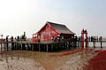 红海滩码头是一处在滩涂上建起的纯木制仿古旅游景观,全长1000余米的两座蜿蜒的九曲廊桥蜿蜒伸入海中,两条“九曲廊桥”自岸边直探进海中,沿着木栈道走走停停,大概半个小时就可以完成,在那么空旷的地方,远眺“红海”蓝天一线相接,心情会象天空的蓝色一样好。红海滩码头还是世界上唯一一处在泥滩上建起的纯木结构的仿古建筑群,妈祖庙和木栈道一样,当然都是为了开发旅游而修建的。在妈祖庙后面的平台的,有几个丹顶鹤——雕塑,主要是为了美化环境和给游人留影用的。站在栈道上远望这由万亩火红的碱蓬草织就的天赐美景,在领略自然美景的同时,再钓几个小蟹子,别有一番情趣。织就红海滩的是一颗颗纤柔的碱蓬草,学名叫翅碱蓬,由于土质的原因,碱蓬草出土的时候就是红色的,随着季节的生长,会越长越红。草底下都是湿泥,有好多好多小蟹子洞。
